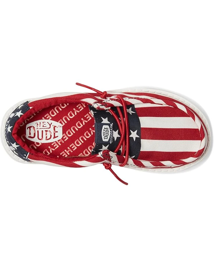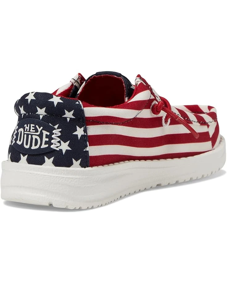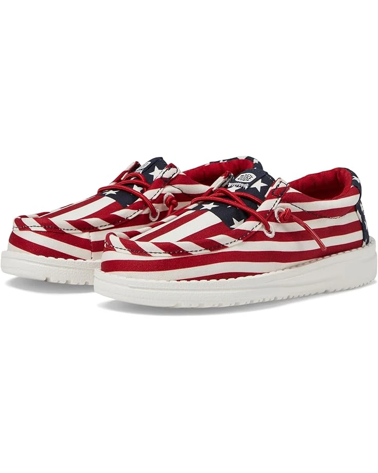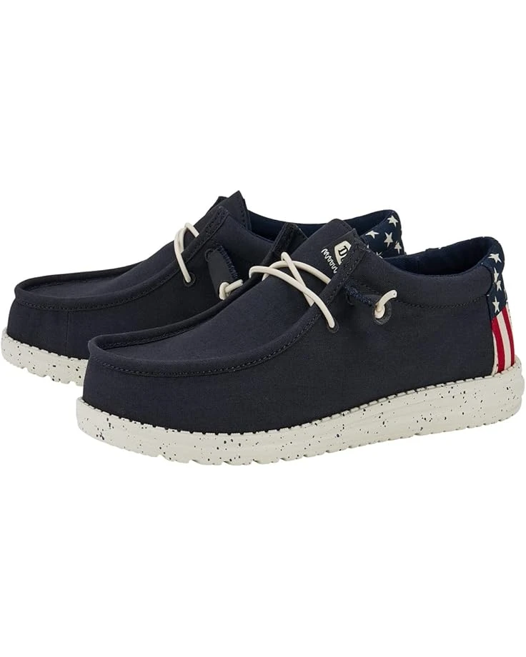- Make outdoor festivities perfectly comfy and stylish for your little one by opting for the Hey Dude® Kids Wally Americana Loafers. The slip-on footwear features canvas upper construction with fixed elastic laces, breathable cotton lining, and rounded toe, low-top silhouette.