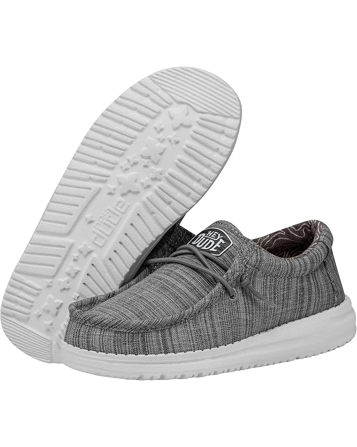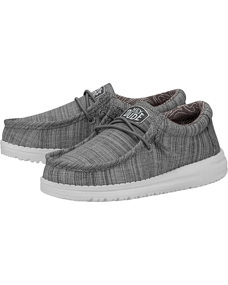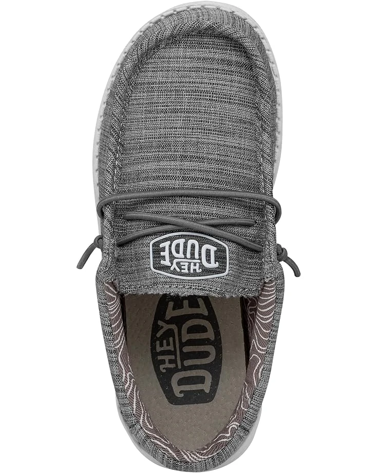- High in quality and authentic in style, the Hey Dude® Kids Wally Linen Loafers are designed to let your junior take their baby steps with confidence while enjoying that lightweight feel and complete freedom of movement. The shoes feature a textured textile upper, a breathable fabric lining, and a removable foam cushioned insole for underfoot support and come in a slip-on style with an elasticized lace detailing on the upper for a secure and precise fit.