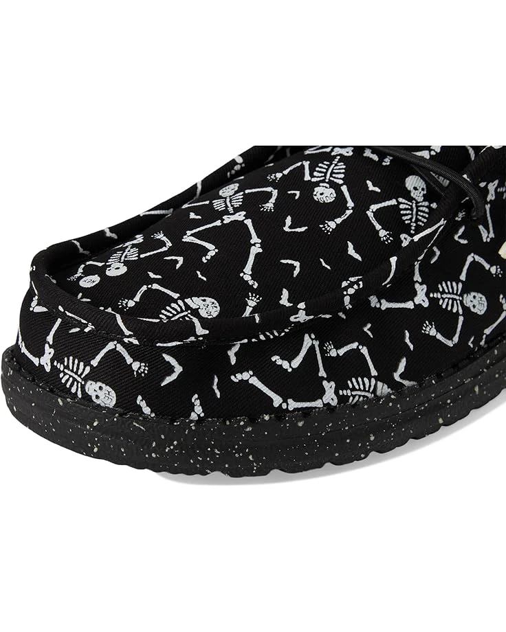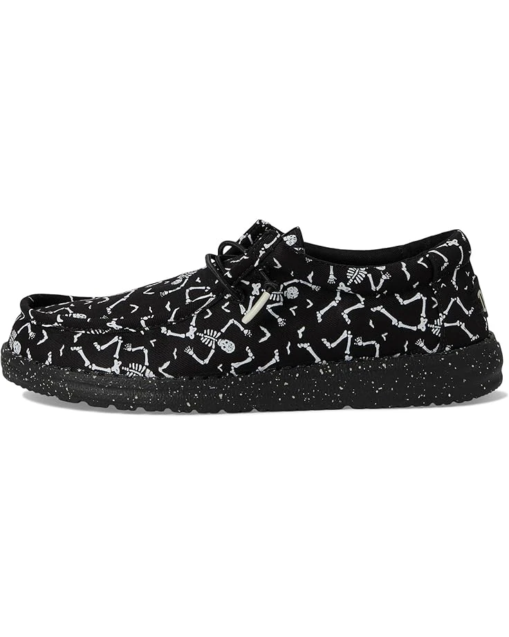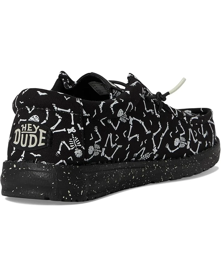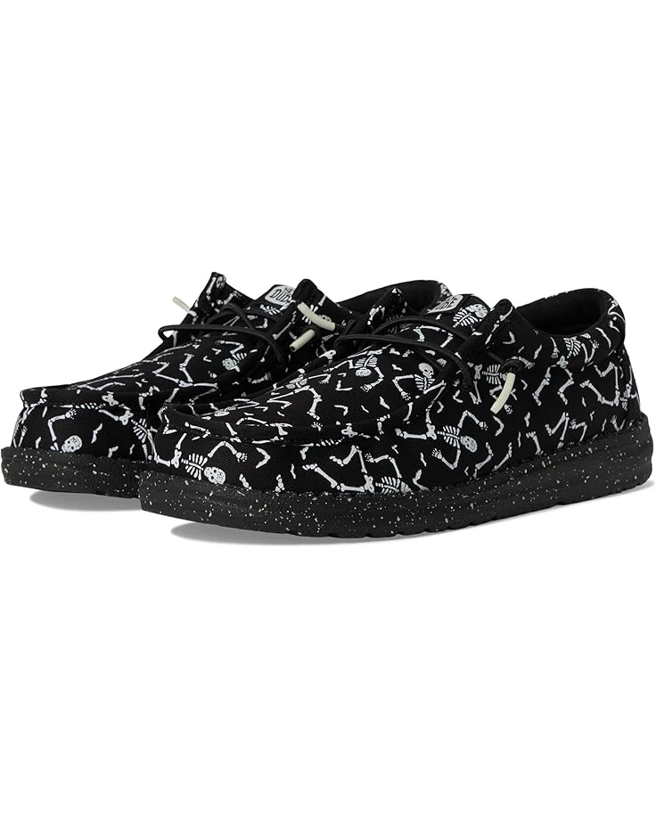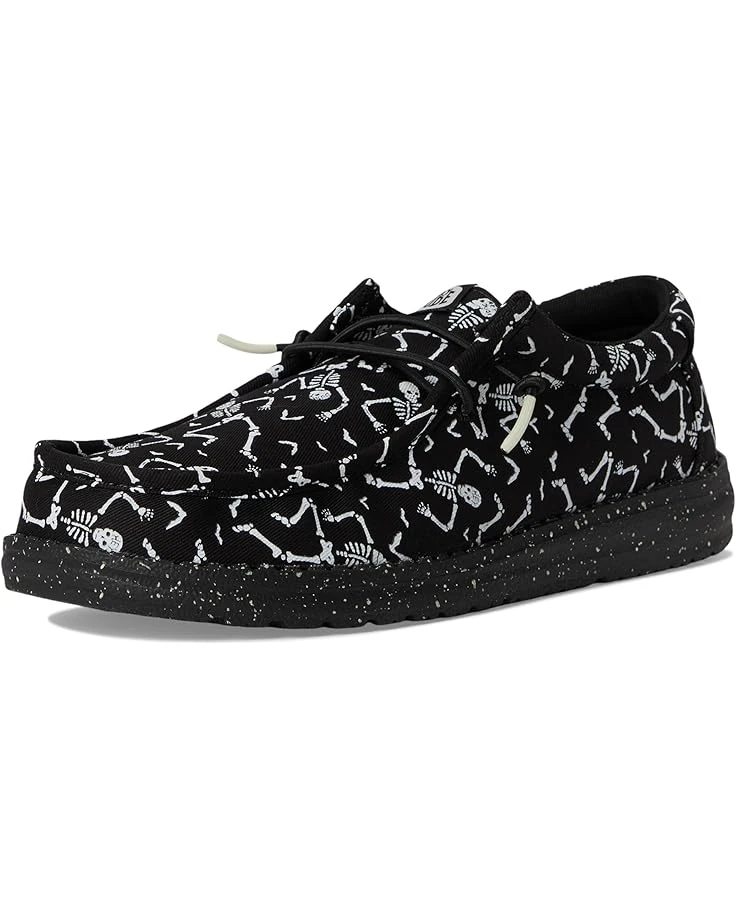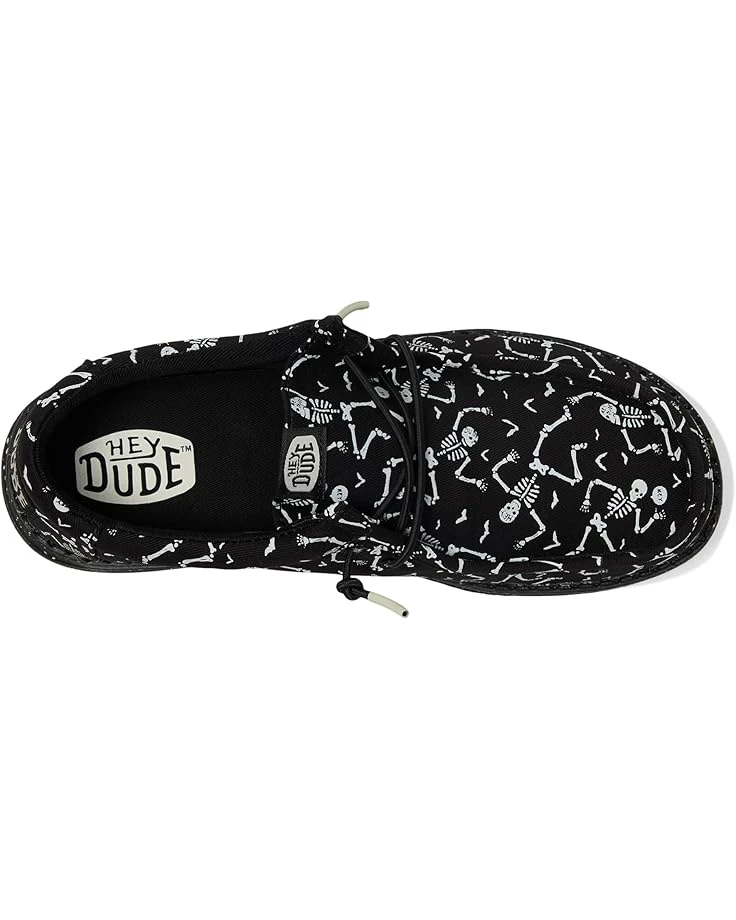 - Hey Dude® Kids Wally Skeletons combine playful style with superior comfort. Crafted with a breathable canvas upper, cotton lining, and durable leather insole, these shoes offer a feather-light feel. The rounded toe design supports healthy foot movement, while the Flex & Fold™ technology and elasticized laces ensure a perfect fit. The rubber outsole provides stability, making them ideal for travel and everyday adventures. With a Memory Foam® cushioned insole that reduces odors and maximizes comfort, these shoes let kids explore the world with ease and flair.