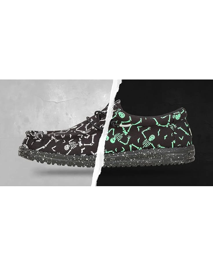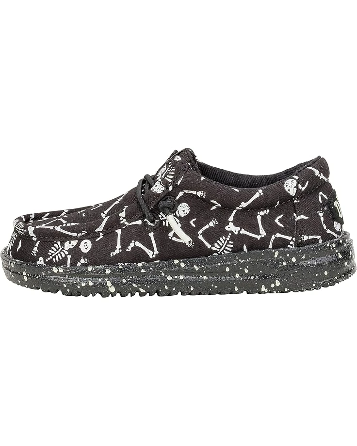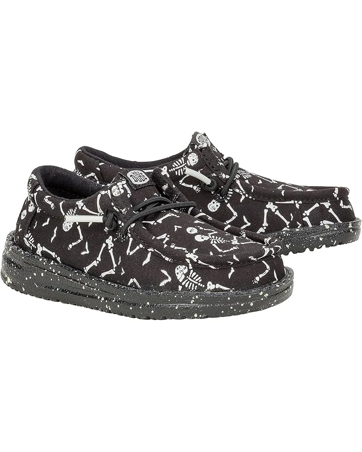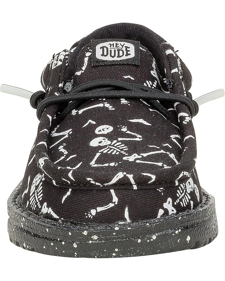 - The Hey Dude® Kids Wally Skeletons shoes hug your kid’s feet like a sweater while staying cushy and airy and always just right. These loafer shoes are crafted with a canvas upper, leather insole, and cotton lining. The Flex & Fold design of these printed sneakers supports healthy feet with its unique shape while the elastic laces ensure a more uniform fit. Lightweight and machine washable, these lace-up loafers are styled with an allover skeleton print for an eye-catching look.