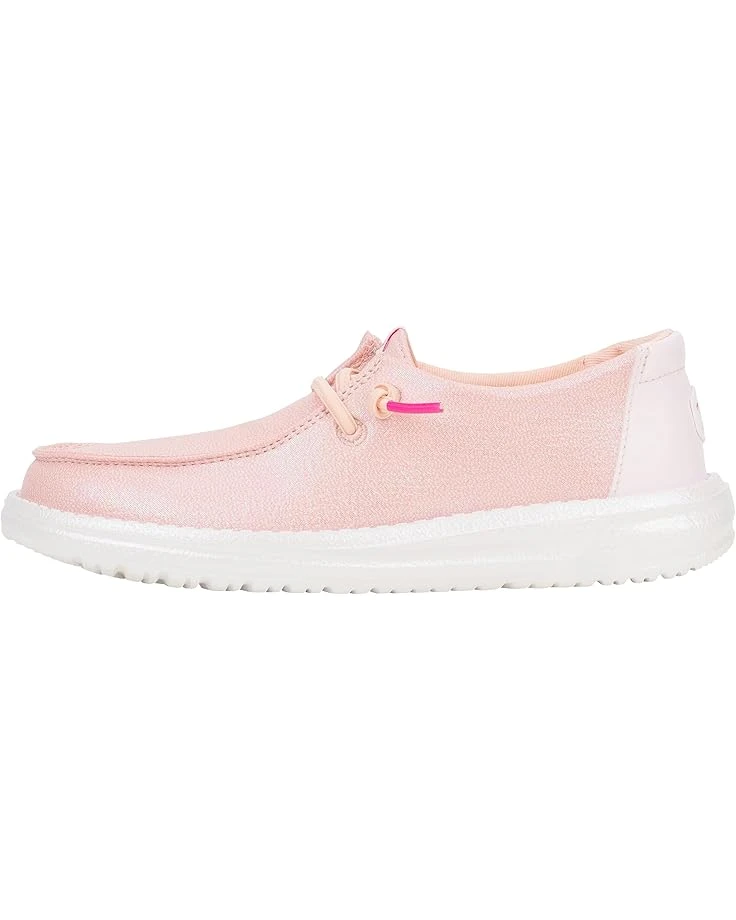 - The Hey Dude® Kids Wendy Iridescent Sparkle shoes hug your kid’s feet like a sweater while staying cushy and airy and always just right. These sneakers are designed with a removable memory foam cushioned insole and cotton lining that provides maximum comfort. The canvas upper of these shoes features a Flex & Fold design that helps support healthy feet while the elastic laces ensure a secure fit. Lightweight and machine washable, these lace-up shoes are crafted with a lightweight and flexible rubber outsole that lets your kid go the extra mile.