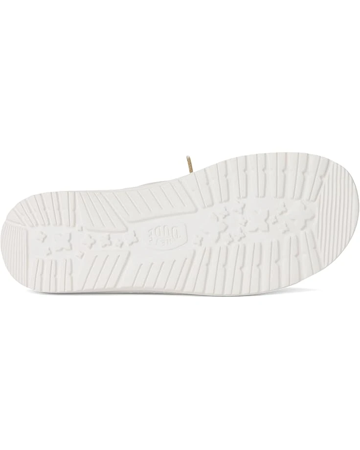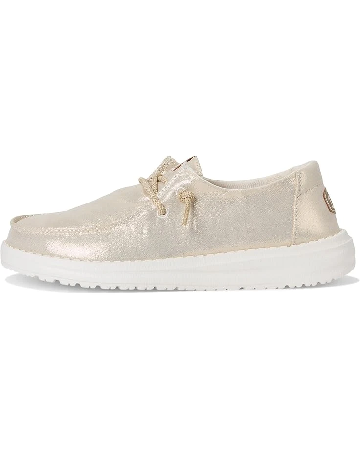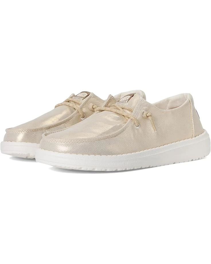 - Spruce up your casual attires by adding glam to them wearing the low-top Hey Dude® Kids Wendy Metallic Shine Loafers. The rounded toe design and flex & fold supports healthy feet with its unique shape giving complete freedom of movement. The lightweight construction with elastic lace detail allows them to flex with the foot, resulting in a shoe that fits more uniformly. The metallic canvas upper, cotton lining, and removable memory foam cushioned insole provides maximum comfort.