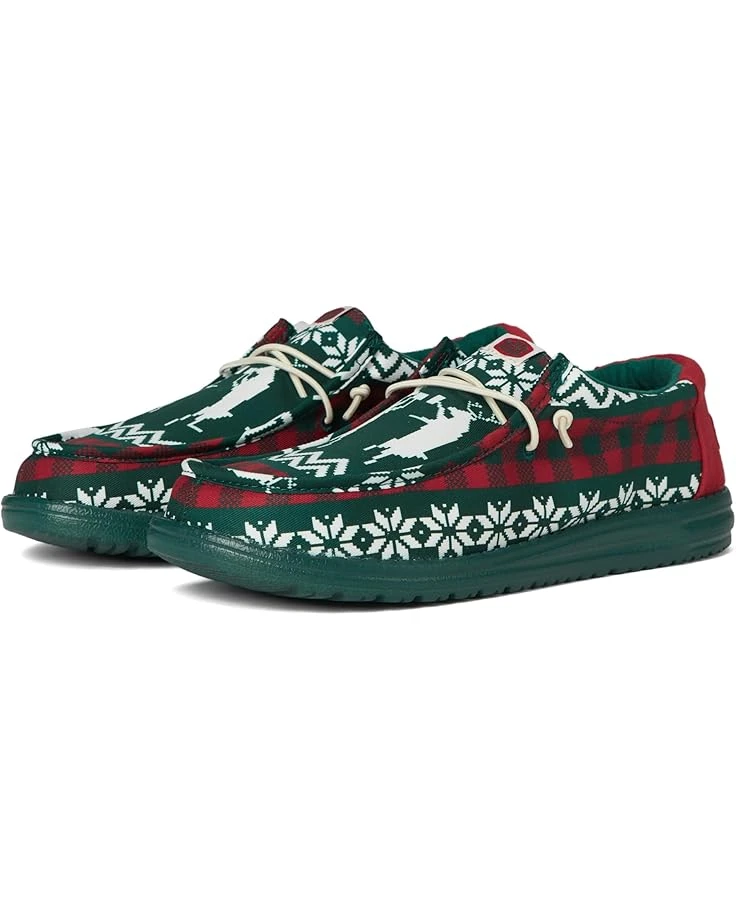 - Featuring a Flex & Fold design that helps support healthy feet by giving complete freedom of movement, the Hey Dude® Wally Holiday Cheers are the perfect choice to add a festive look to your outfits. These loafers are made of a lightweight textile upper with elastic laces for a secure fit. The removable textile insole and textile lining provide maximum comfort. Comfortable and durable, these lace-up loafers are great for travel and on the go.