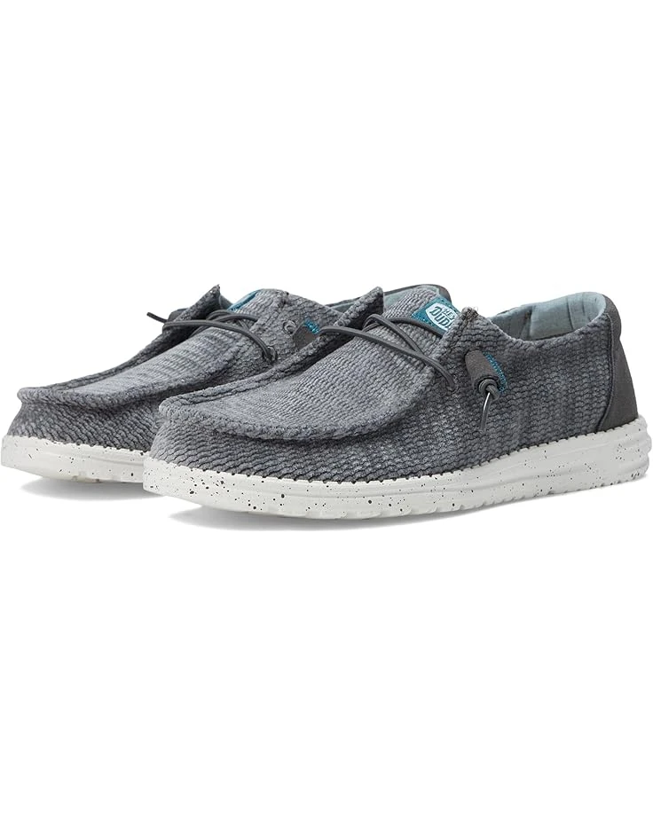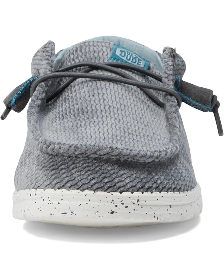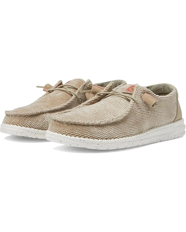 - Pick these Hey Dude® Wendy Wave Corduroy sneakers for a casual evening outing in the city. The shoes have moc toe and slip-on style with two-eyelet elastic panels. The flat platform makes it comfortable for daily walks. The shoes are made of leather and textile upper. It is lined with textiles and features a removable textile insole.