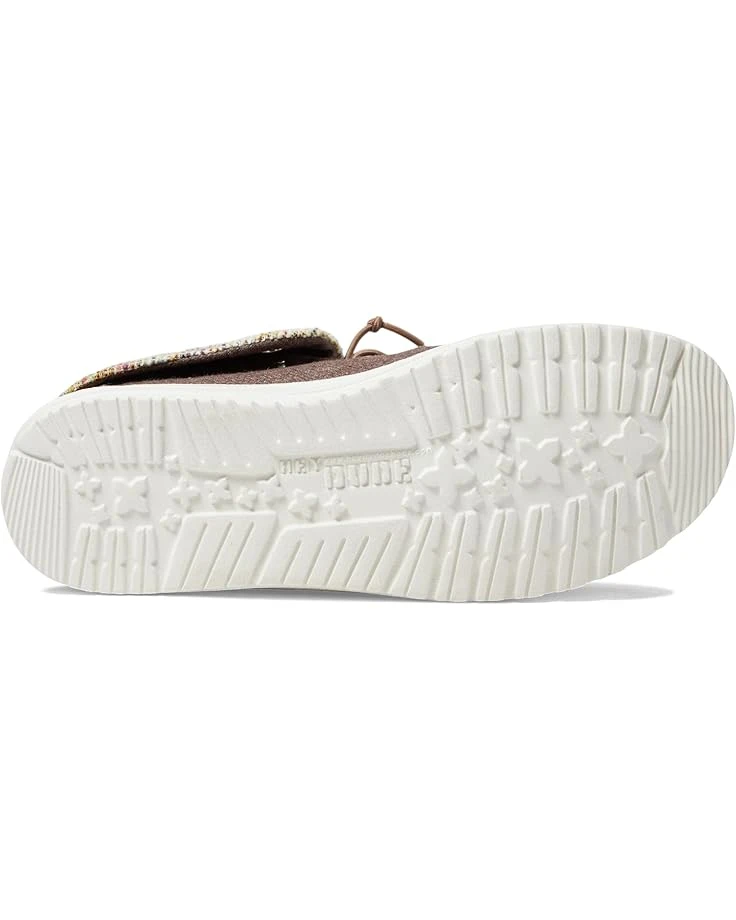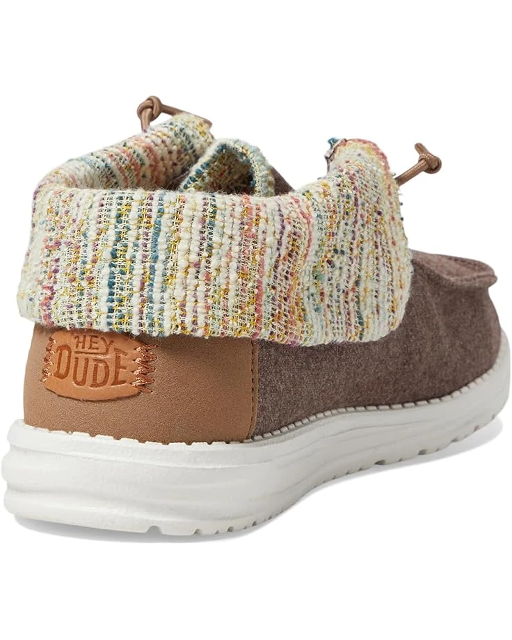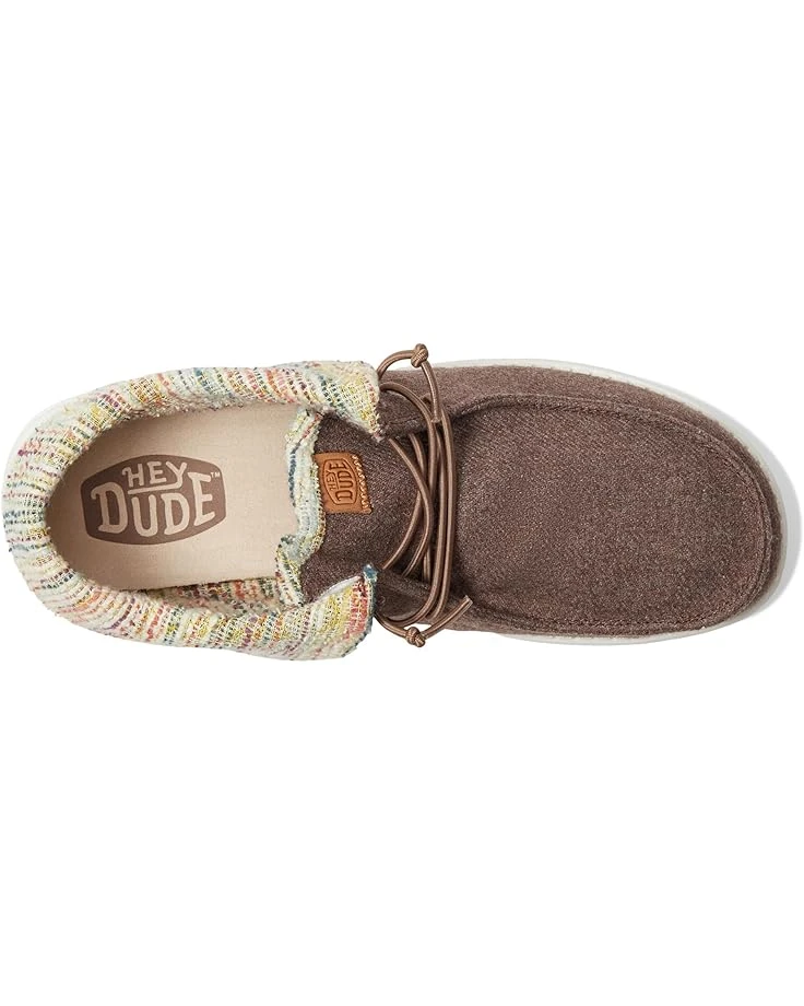 - Give your feet warmth and comfort by wearing Hey Dude® Wendy Wooly Twill Fold Boot. The boots come with a textile and synthetic upper, textile lining, and removable textile insole. The boots feature a round toe shape and lace detailing for adjustability.